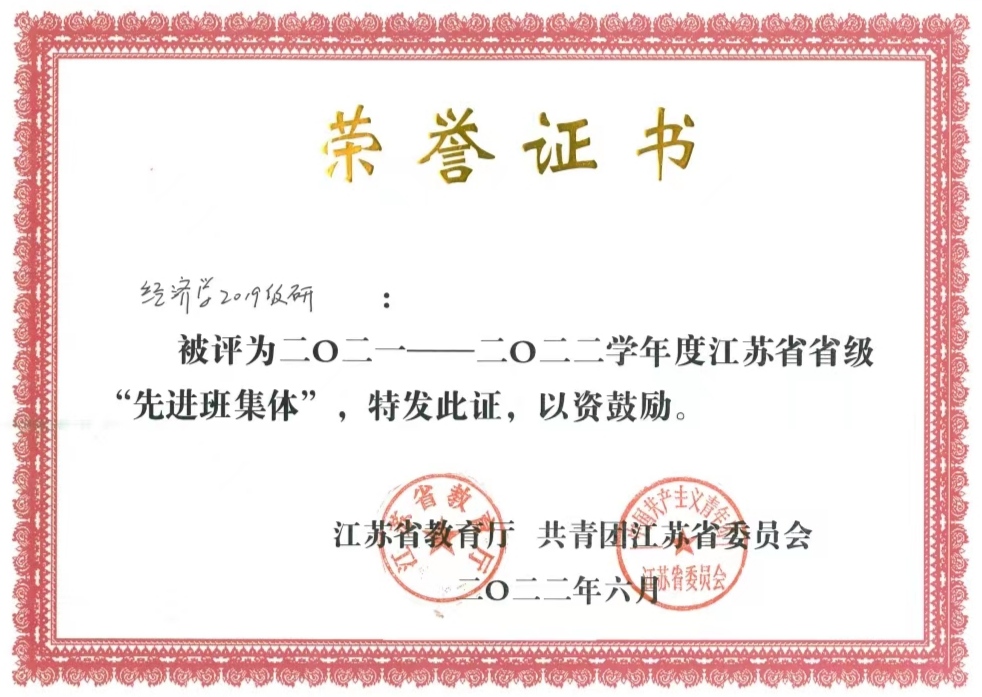 近日,江苏省教育厅、团省委下发通知,在各高校层层推荐、择优遴选的基础上,经审核、公示,万象城官网经济学2019级研被评为江苏省普通高校省级“先进班集体”,2020级应用统计专业黄欣媛被评为江苏省普通高校省级“优秀学生干部”,2019级人口、资源与环境经济学专业王庆玲被评为江苏省普通高校省级“优秀毕业生”。