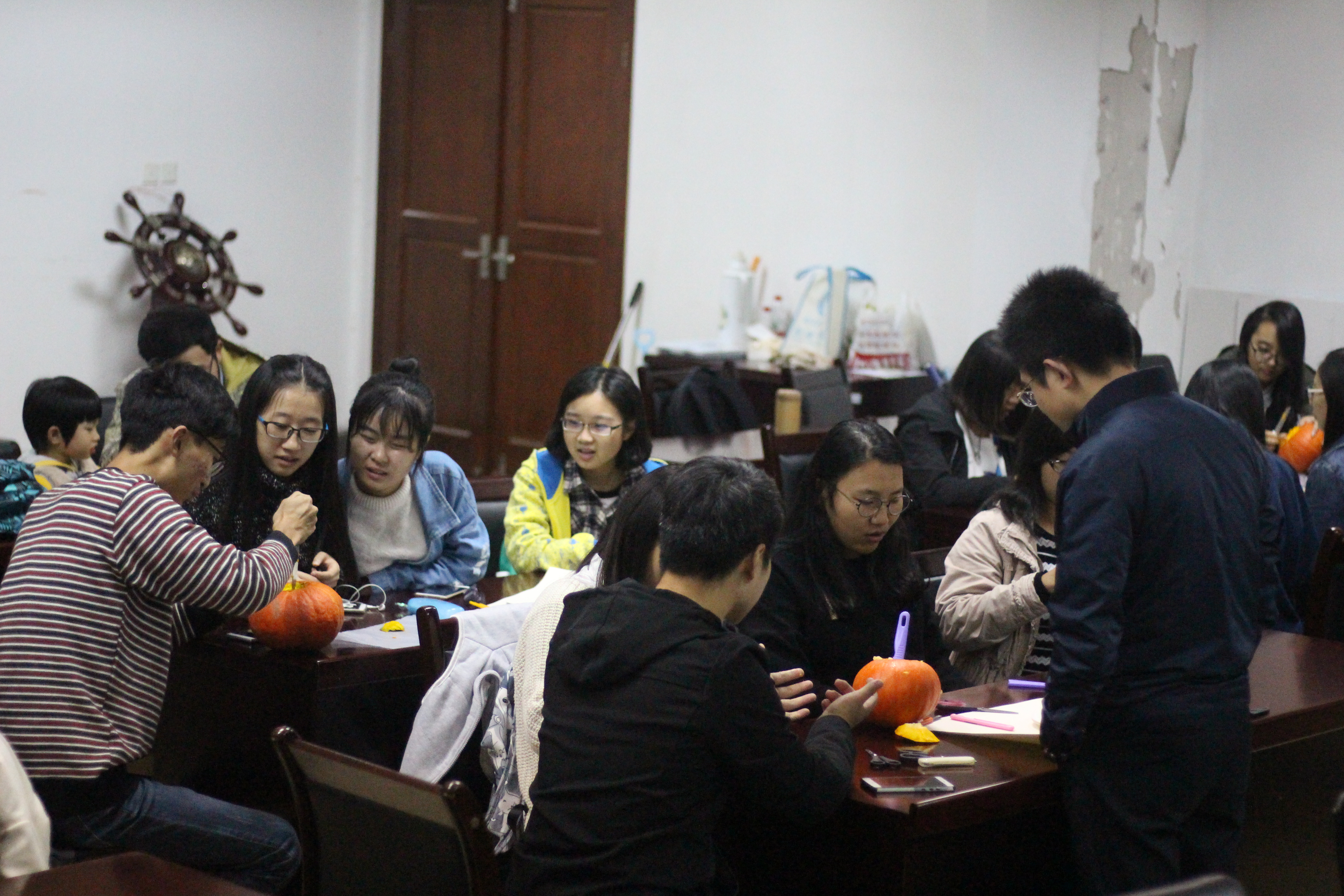 每年的11月1日是西方的万圣节,为了迎合万圣节的气氛,10月30日晚,万象城官网英语角的师生们在经济学科楼307室举办了制作南瓜灯活动。万象城官网外教Jeffrey Smith在现场指导制作,经济系系主任周绍东老师也带着家人参加了该活动。